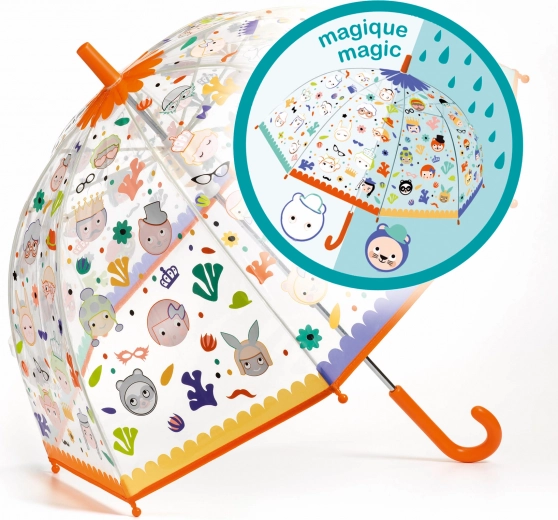 Wyjątkowy dziecięcy parasol marki Djeco, który zaskoczy małych użytkowników zabawnymi zmianami kolorów. Parasol z motywem twarzy został zaprojektowany tak, aby przy kontakcie z wodą zmieniał barwy, czyniąc każdą deszczową chwilę jeszcze bardziej magiczną: