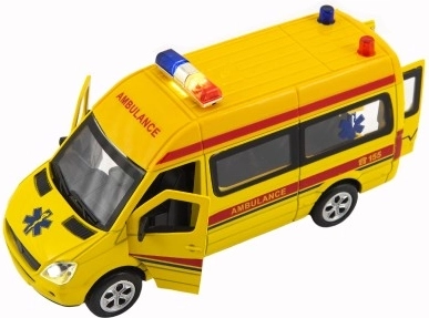 Ta szczegółowo wykonana karetka łączy solidny metalowy korpus z wytrzymałymi plastikowymi elementami i jest idealna do kreatywnej zabawy. Dzięki napędowi typu pull‑back jeździ bez konieczności zdalnego sterowania, a otwierane przednie i tylne drzwi zwiększają autentyczność i interaktywność.