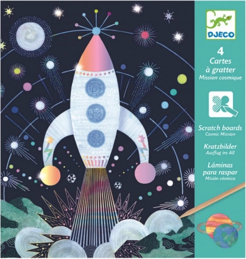 Obrazki do zdrapywania Misja kosmiczna od Djeco to wspaniała kreatywna zabawa dla dzieci. Dzięki tym zestawom dzieci odkrywają magiczne piękno kosmicznych obrazków ukrytych pod zdrapywaną warstwą.