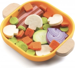 1 drewniana patelnia z rzepem, 1 metalowa łopatka, 1 talerz, 6 drewnianych produktów z rzepem, 28 filcowych kawałków