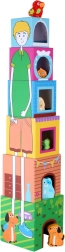Ta urokliwa wieża do układania z wytrzymałych kartonowych klocków i drewnianych zwierzątek uczy dzieci porządkowania wielkości, szacowania przestrzeni i ćwiczy zręczność. Klocki układa się od największego do najmniejszego w stabilną wieżę o wysokości do ok. 58 cm, a dzięki otworom w klockach dzieci wkładają do nich właściwe zwierzątka.