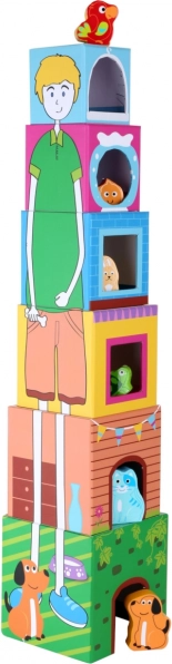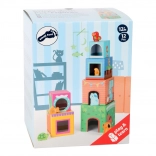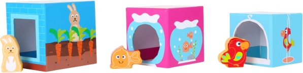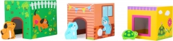 Kolorowy zestaw do układania z kartonowymi klockami i sześcioma drewnianymi zwierzątkami dla najmłodszych. Dzieci układają od największego do najmniejszego i trenują małą motorykę, koordynację ręka–oko oraz logiczne myślenie. Każde zwierzątko odnajdzie swój właściwy domek w pasującym otworze. Bezpieczna zabawka dla dzieci od 12 miesięcy.