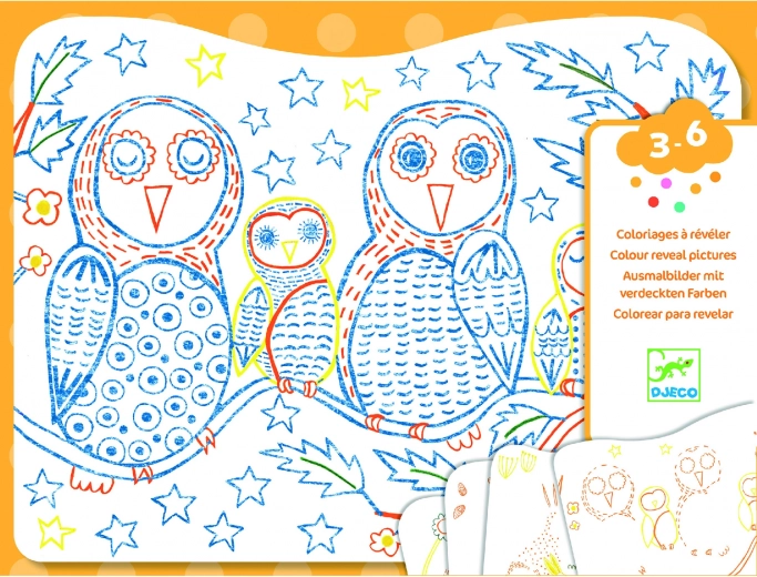 Odkryj zabawę z magicznym kolorowaniem od DJECO, które oferuje zestaw z motywami sowy i jej przyjaciół. Każdy obrazek zmienia się dzięki magicznemu pędzelkowi, odsłaniając piękne kolory i detale.