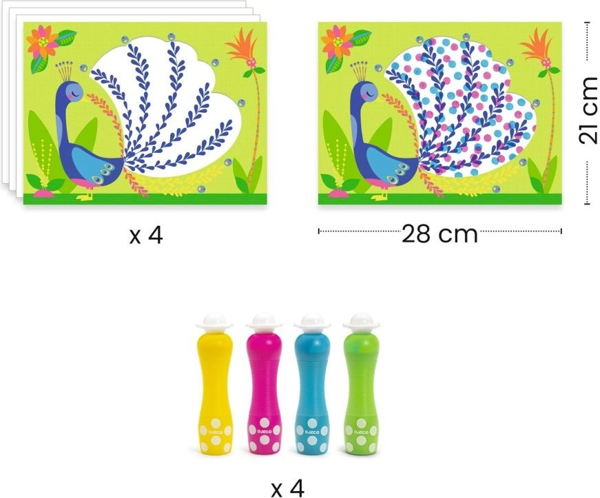Kreatywny zestaw do pierwszych prób plastycznych z kropkowaniem od marki Djeco. Zawiera 4 piankowe pisaki z zmywalnym atramentem, idealne dla małych rączek od 18 miesięcy. Dzieci w zabawny sposób uczą się kolorów i mieszania barw, kropki można nanosić swobodnie także poza kontury – wystarczy zamknąć kieszeń, a drobne pomyłki znikną. Świetne efekty bez stresu i zabawa dla całej rodziny.