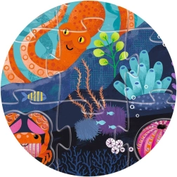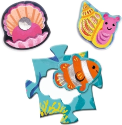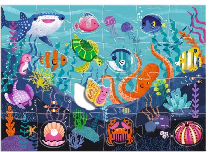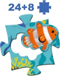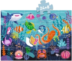 Odkryj zabawne i edukacyjne puzzle Djeco dla małych odkrywców! Ułóż duży obraz morza z 24 elementów, a następnie uzupełnij go 8 kształtnymi elementami przedstawiającymi morskie zwierzęta, dopasowując je w odpowiednie miejsca. Wspiera motorykę małą, logiczne myślenie i rozpoznawanie zwierząt. Idealne dla dzieci od 3 lat.