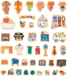 W zestawie znajduje się 40 wysokiej jakości magnetycznych elementów z kocimi postaciami i domowymi akcesoriami. Dzieci mogą rozwijać słownictwo, opowiadać historie i ćwiczyć wyobraźnię przestrzenną, dekorując poddasze, sypialnię, kuchnię, salon, łazienkę i pokój zabaw.