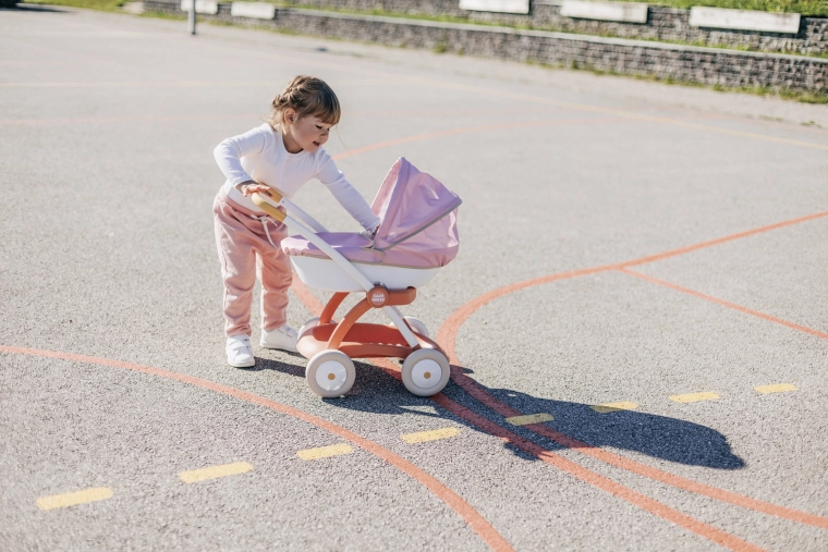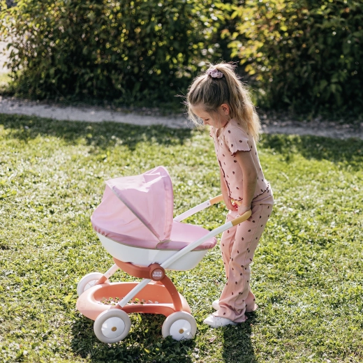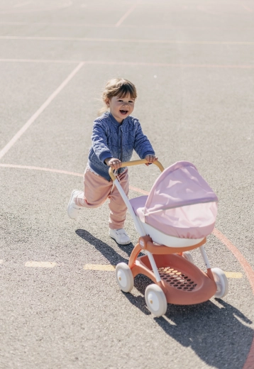 Praktyczna gondola z plastikową korpą i składaną budką chroni lalkę przed słońcem i wiatrem. Tekstylny pokrowiec dodaje wózkowi delikatnego wyglądu, a pod gondolą znajduje się kosz na akcesoria. Zabawa wózkiem wspiera umiejętności opiekuńcze, wyobraźnię i subtelnie rozwija motorykę.