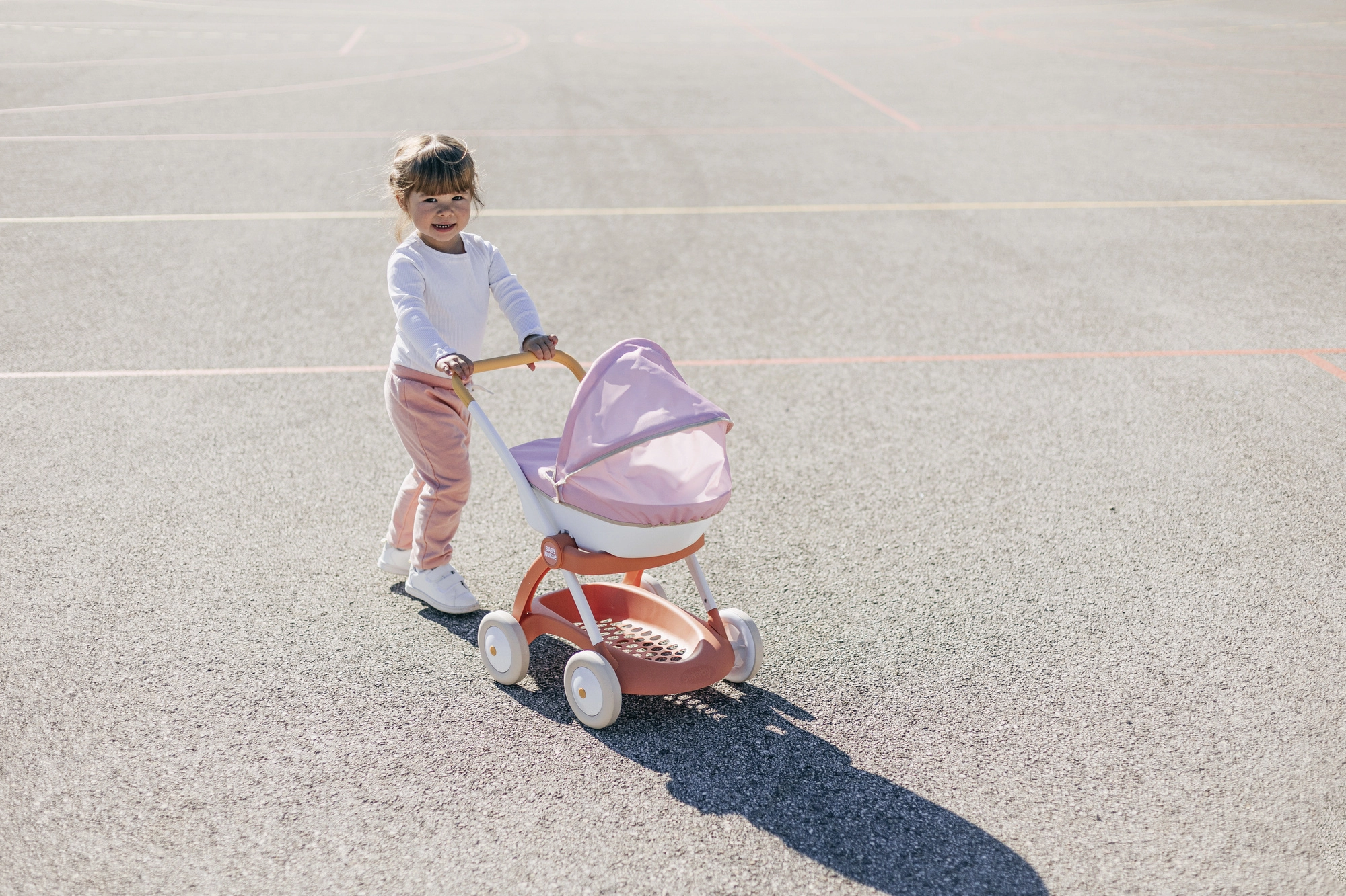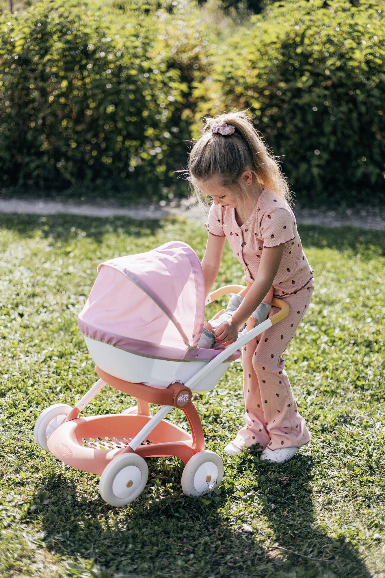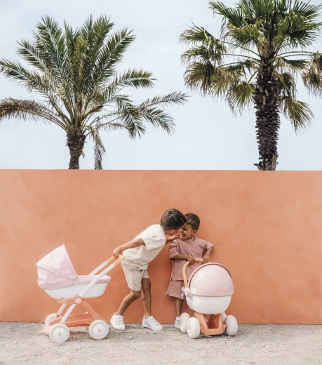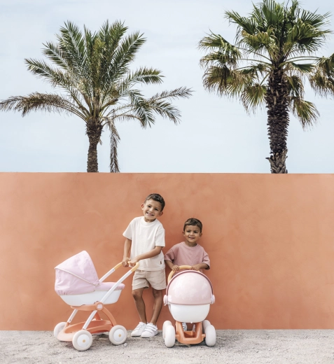 Wózek dla lalek Smoby Baby Nurse w różowo-morelowo-białej kolorystyce jest stworzony do codziennych spacerów z ulubioną lalką. Dzięki metalowej ramie i cichym kółkom jazda jest płynna i stabilna, a ergonomiczna rączka ułatwia prowadzenie nawet młodszym dzieciom.