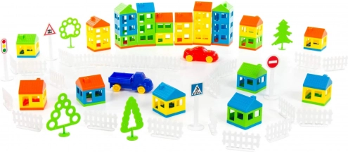 Zestaw zawiera kolorowe elementy, takie jak domy, pojazdy, drzewa i znaki drogowe, które wciągają dzieci w świat fantazji i kreatywności.