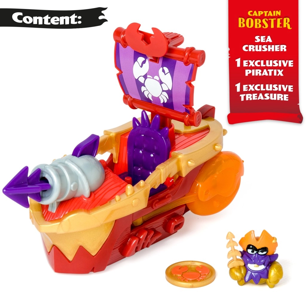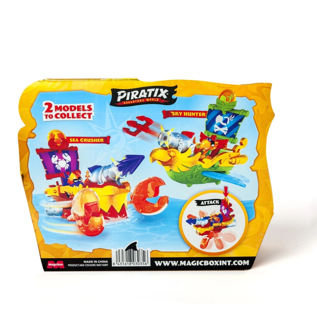 Poznaj statek piracki Sea Crusher z linii Piratix Adventure World. Ten statek oferuje niekończone możliwości dynamicznej zabawy z armatą i kolorowymi detalami.