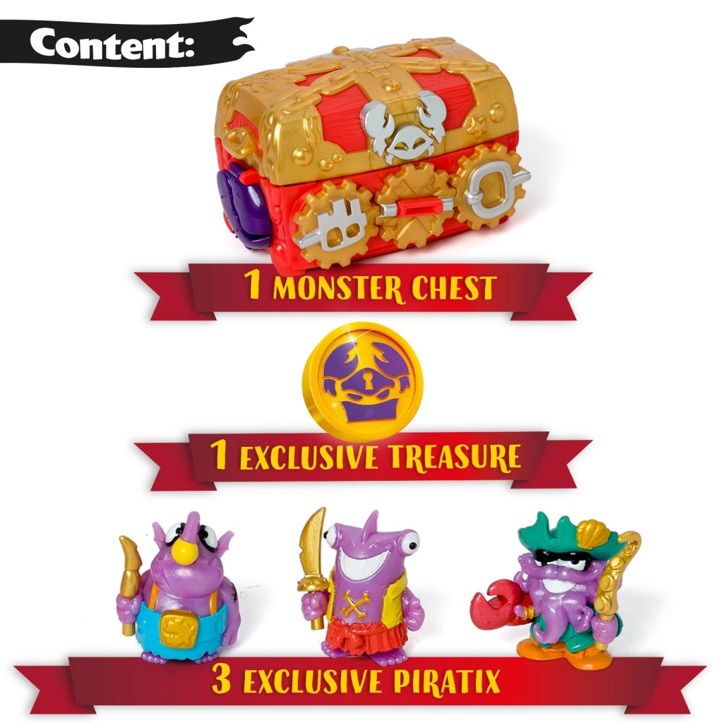 1 skrzynia Skarbu Potwora, 3 ekskluzywni Piratixowie, 1 ekskluzywna moneta skarbu, 3 akcesoria