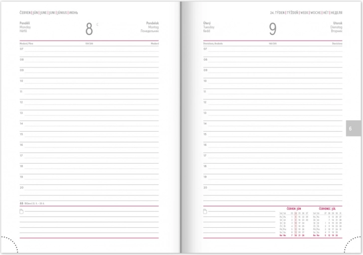 Codzienny kalendarz jest zaprojektowany z myślą o Twojej potrzebie efektywnej organizacji. Zawiera czesko-słowacki kalendarz z dodatkowymi językami, takimi jak angielski, niemiecki, węgierski i rosyjski.