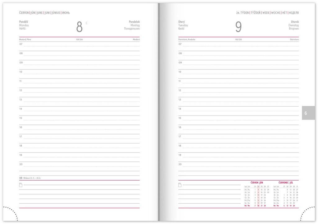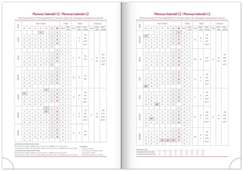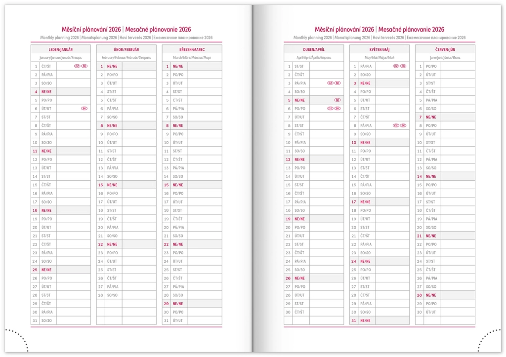 Dzienny kalendarz Aprint Top 2026 to stylowy i praktyczny towarzysz na każdy dzień w turkusowym kolorze. Oferuje harmonogram z kalendarzem czesko-słowackim oraz językami dodatkowymi, takimi jak angielski, niemiecki, węgierski i rosyjski.