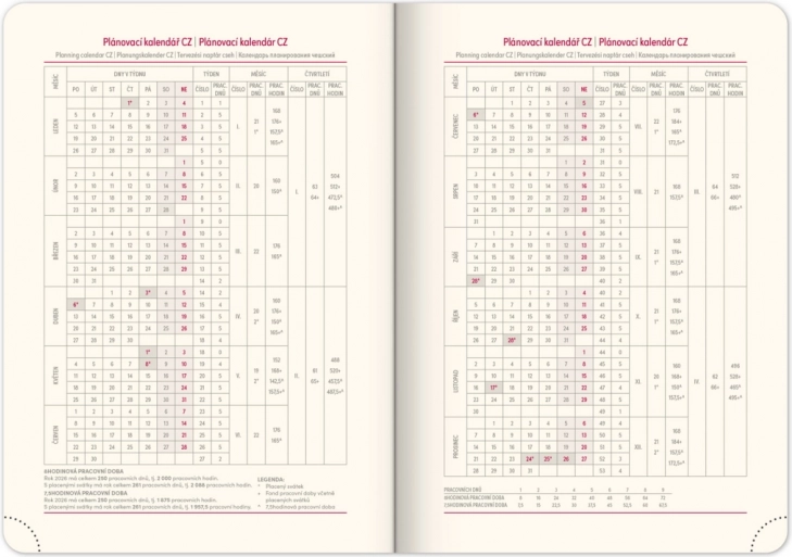 Dziennik zawiera codzienny harmonogram z czesko-słowackim kalendarzem oraz dodatkowymi językami, w tym angielskim, niemieckim, węgierskim i rosyjskim.