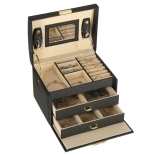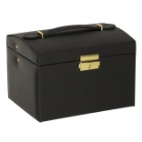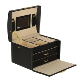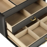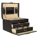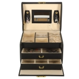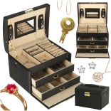 Pomysłowy układ obejmuje wałki na pierścionki, przegródki na drobiazgi oraz 2 wysuwane szufladki z podziałem na łańcuszki, bransoletki i kolczyki. Zamykanie na kluczyk i niezawodny zatrzask zapewniają bezpieczne przechowywanie cennych przedmiotów.