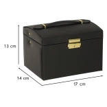 Elegancka czarna szkatułka na biżuterię z lusterkiem i szufladkami do przejrzystego przechowywania pierścionków, kolczyków, bransoletek i naszyjników. Oferuje pojemne przegródki, dwie szuflady, miękką wyściółkę chroniącą przed zarysowaniami oraz zamek na kluczyk dla większego bezpieczeństwa. Idealne rozwiązanie do zorganizowanego przechowywania biżuterii w domu i w podróży.
