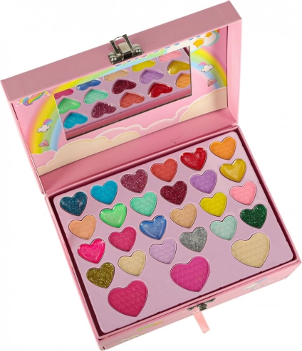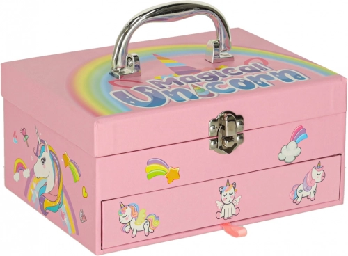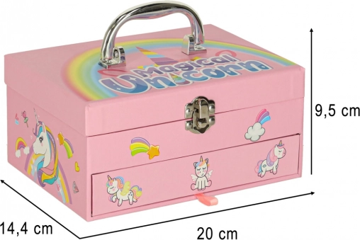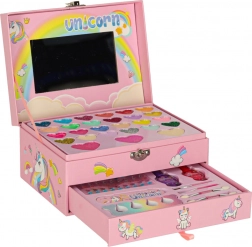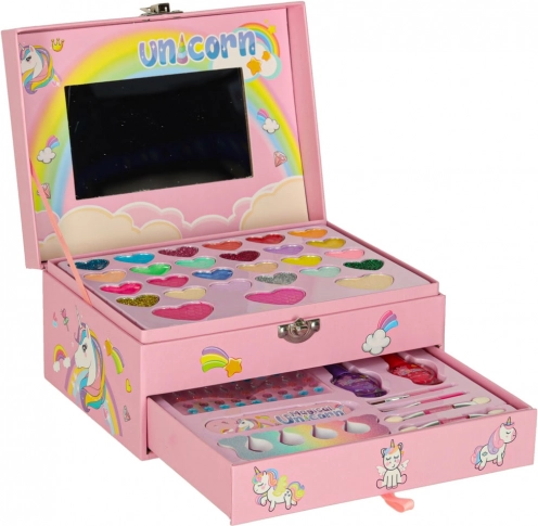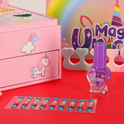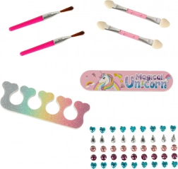 Ten dziecięcy zestaw kosmetyczny z motywem jednorożca ucieszy wszystkie małe księżniczki. Zawiera cienie do powiek, lakiery do paznokci oraz inne narzędzia potrzebne do tworzenia pięknych stylizacji.