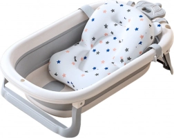 Wanienka jest wyposażona w stabilny, składany stelaż z antypoślizgowymi nogami, które zwiększają przyczepność i zapobiegają niechcianemu przesuwaniu. Jest wykonana z bezpiecznych, nietoksycznych materiałów PP i TPE, które są delikatne dla wrażliwej skóry dziecka i odporne na uszkodzenia. W zestawie znajduje się miękka mata kąpielowa, która utrzymuje dziecko w wygodnej pozycji, zapewniając mu ciepło i poczucie bezpieczeństwa.