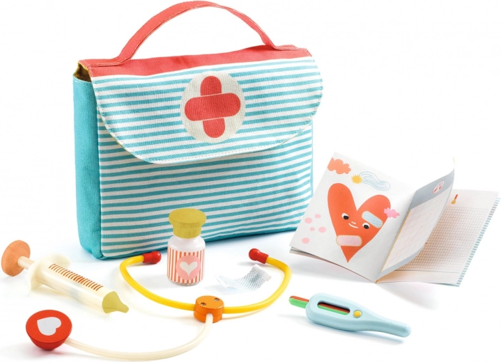 Lekarski kuferek DJECO to idealny prezent dla małych miłośników medycyny. Zawiera wszystko, co potrzebne do zabawy w doktora: termometr, który zmienia kolor, stetoskop, strzykawkę, buteleczkę na lekarstwa, bandaż oraz kartę zdrowia.