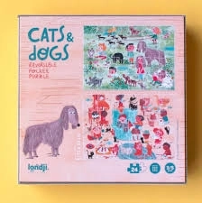 Odkryj zabawę z dwustronnymi puzzlami Londji, które przedstawiają urocze ilustracje psów i kotów wraz z ich opiekunami. Świetny wybór dla dzieci od trzeciego roku życia.