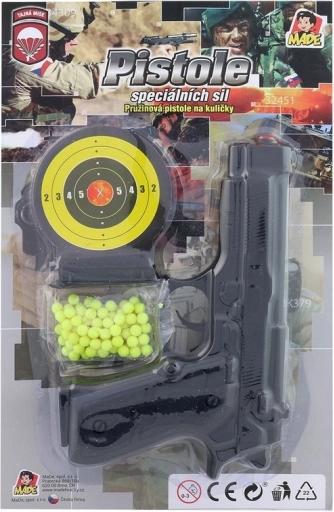 Ciesz się zabawą z tym dziecięcym pistoletem na kulki, który zawiera zapasowe kulki dla niekończącej się gry.