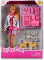 Zostań weterynarką z lalką Lucy i jej uroczymi pieskami. Kompletny zestaw z białym fartuchem i akcesoriami do badania zwierzęcych pacjentów.