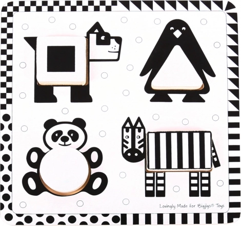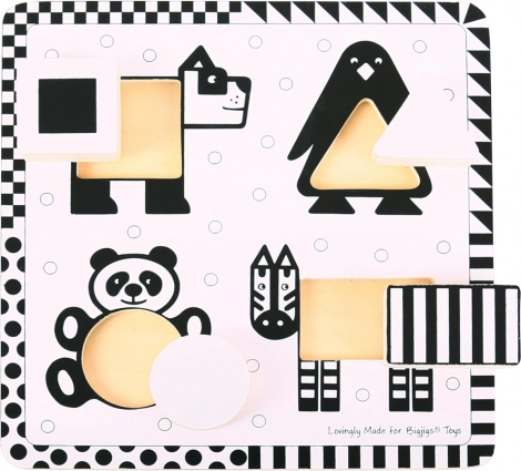 Odkryj pierwszą układankę dla najmłodszych: czarno-białą układankę wpuszczaną z litego drewna z motywami zwierzątek. Kontrastowe kolory wspierają percepcję wzrokową, a duże elementy łatwo trzymać małymi rączkami. Rozwija małą motorykę, zmysły i koncentrację. Wykonana z wysokiej jakości, odpowiedzialnie pozyskiwanego drewna, spełnia europejskie normy bezpieczeństwa.