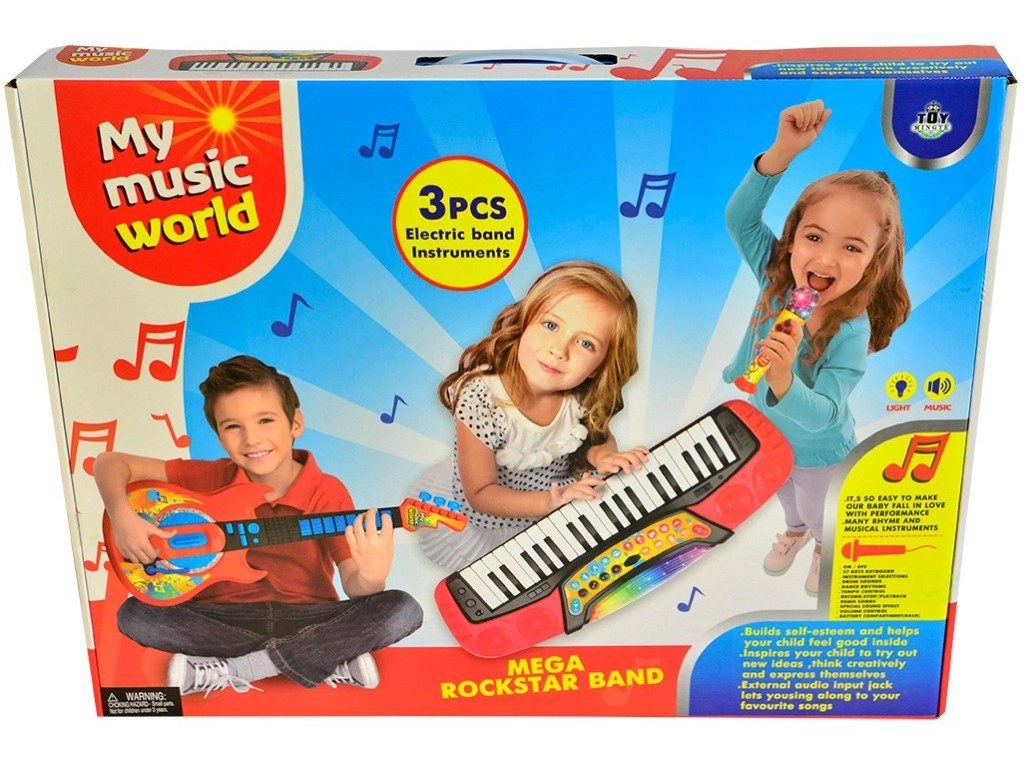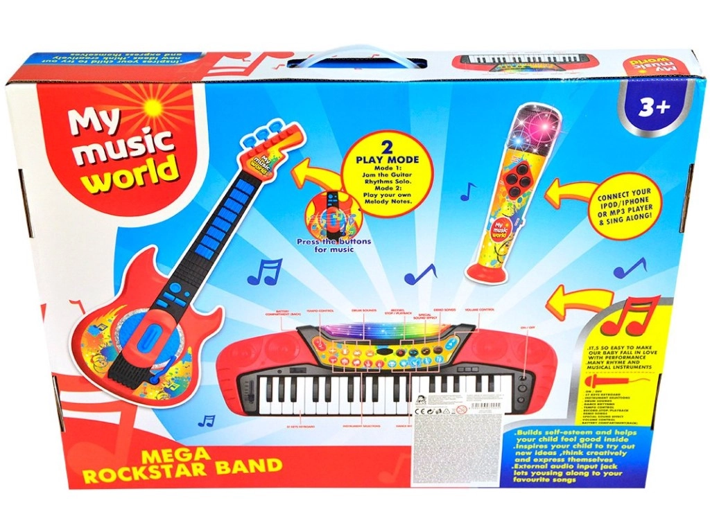 Super zabawny i interaktywny zestaw 3 w 1 zawiera elektroniczne pianino z 37 klawiszami, gitarę i mikrofon. Idealny dla małych muzyków!