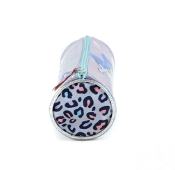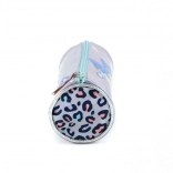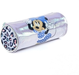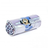 Błyszcząca powierzchnia z motywem Minnie oraz wyrazistym, panterkowym wzorem na końcu piórnika.