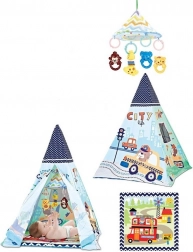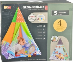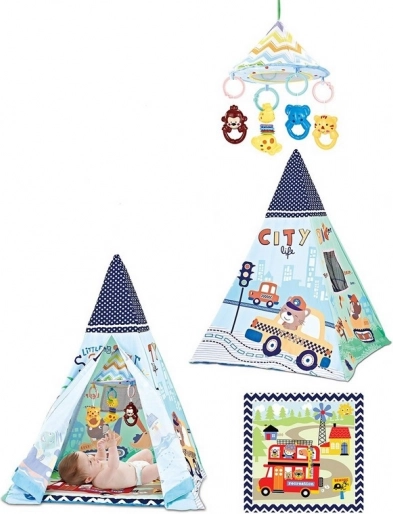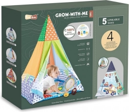 Ten zabawny namiot jest idealny dla dzieci od urodzenia. W zestawie znajduje się wiele zabawek, które są bezpiecznie przymocowane klipsem. Zabawki można łatwo przypiąć do wózka, łóżeczka lub fotelika samochodowego dzięki uniwersalnemu klipsowi, który może również służyć jako gryzak. Klipsy zostały zaprojektowane tak, aby pomagały trenować chwyt u dzieci. Namiot jest lekki i łatwy do przenoszenia, co umożliwia zabawę w dowolnym miejscu.