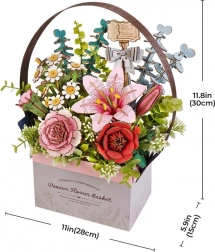 RoboTime 3D drewniana układanka Koszyk Kwiatowy oferuje wyjątkowe doświadczenie tworzenia. Kwiaty, takie jak różowa lilia, czerwona róża czy różowy goździk, symbolizują podziw, pasję i wdzięczność. Modelowanie 3D wspiera rozwój małej motoryki, logicznego myślenia i cierpliwości. Świetna dekoracja lub prezent dla kreatywnych osób. Układanka zawiera 428 elementów precyzyjnie wyciętych laserowo, które łatwo do siebie pasują, tworząc stabilny i wytrzymały model. Koszyk ma otwory do łatwego rozmieszczenia kwiatów według własnej wyobraźni.