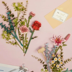 W opakowaniu znajdują się wszystkie potrzebne elementy: drewniany koszyk, różowa lilia, czerwona róża, rumianek, różowy goździk, eukaliptus i rośliny dekoracyjne. Zestaw dostarczany jest w formie niezłożonej z szczegółową instrukcją montażu.
