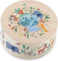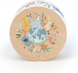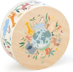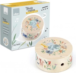 Odkryj magię muzyki z Vilac Drewnianym Cajónem Zwierzęta świata, który zachwyca nie tylko designem utalentowanej artystki Sarah Betz, ale także wszechstronnym zastosowaniem: