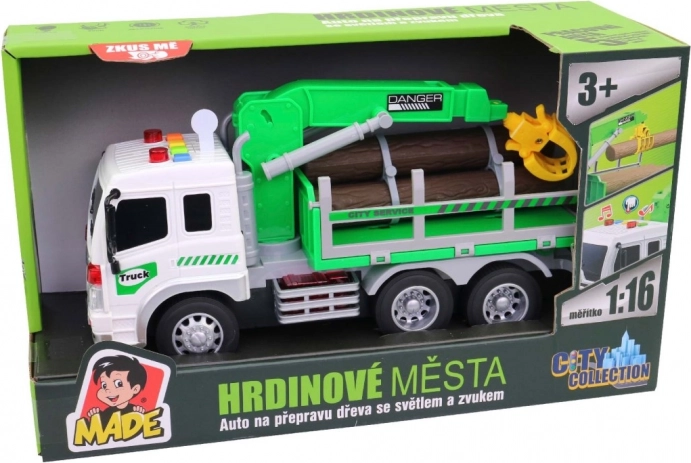 Samochód do transportu drewna z podnoszonym ramieniem, efektami świetlnymi dla dzieci 3+, wraz z bateriami.