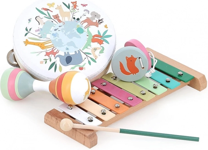Ten piękny zestaw muzyczny zawiera wszystko, czego potrzeba, aby zapewnić dzieciom pierwsze kroki w świat muzyki, zabawy i wyobraźni. Zawiera tamburyn, ksylofon z pałeczką, podwójne grzechotki (rumba) oraz kastaniety. Nie są to instrumenty muzyczne, lecz zabawki, które pomagają dzieciom rozwijać miłość do muzyki i rytmiki.