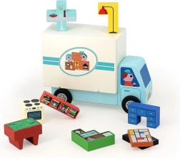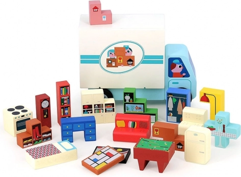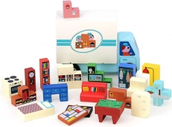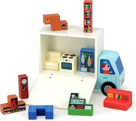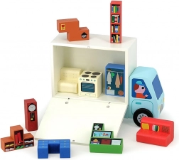 Zestaw zawiera drewniany samochód do przeprowadzki i 19 klocków-mebli, idealnych do samodzielnej oraz wspólnej zabawy z rodziną.
