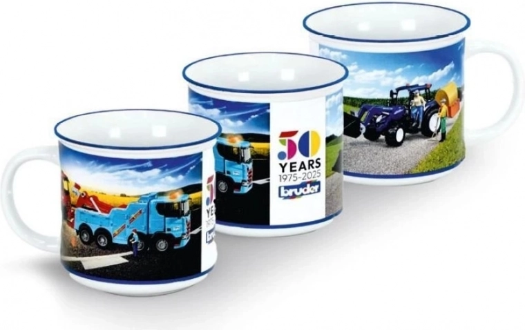 Stylowy kubek reklamowy Bruder z porcelany z motywami ulubionych zabawek na przyjemny start dnia.