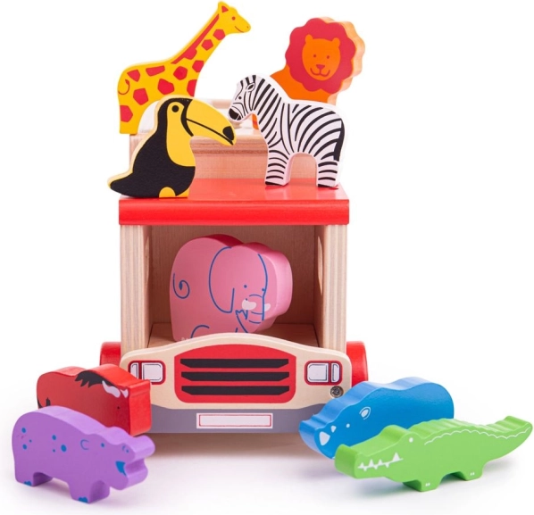 Ta kolorowa drewniana zabawka zawiera rozpoznawalne zwierzęta, które można załadować na ciężarówkę za pomocą specjalnych otworów w dachu i bokach pojazdu. Dzieci mogą segregować kształty i uczyć się o różnych zwierzętach, a następnie umieszczać każde zwierzę w odpowiednim otworze. Gdy wszystkie zwierzęta znajdą się na swoim miejscu, tylne drzwi ciężarówki zamkną się i będą gotowe na kolejną przygodową podróż.