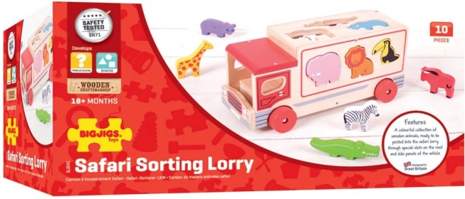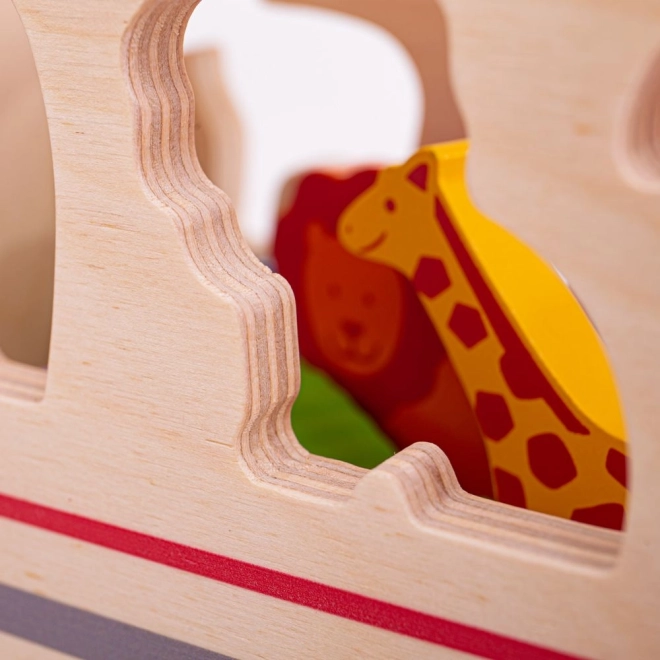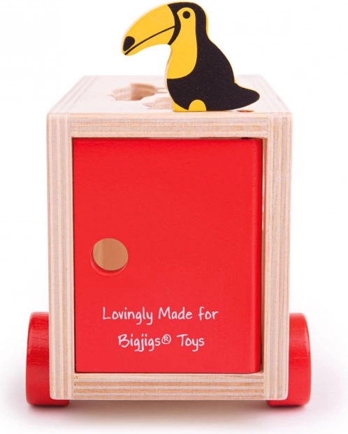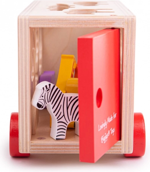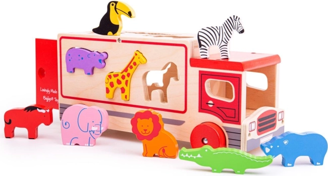 Drewniana ciężarówka działa jako segregator kształtów, dzięki czemu dzieci mogą rozwijać swoje umiejętności w rozpoznawaniu wzajemnych kształtów.