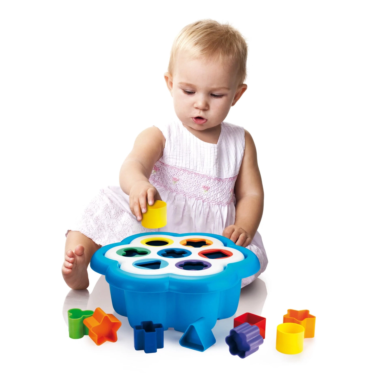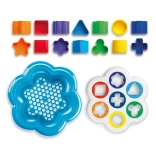 Zestaw zawiera 14 kolorowych elementów w 7 różnych kształtach oraz praktyczne kwiatowe pudełko z pokrywką, do którego po zabawie wszystko łatwo schować. Trwałe i łatwe do umycia wykonanie z bezpiecznego plastiku zapewnia długą żywotność zabawki.