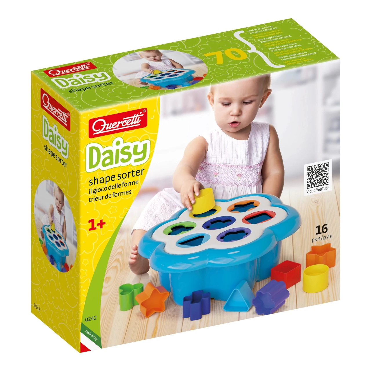 Popularna układanka QUERCETTI DAISY rozwija dziecięcą wyobraźnię, motorykę małą oraz rozpoznawanie kształtów i kolorów. Dzieci wkładają kolorowe elementy do odpowiednich otworów i trenują koordynację ręka–oko, myślenie logiczne oraz cierpliwość. Elementy wykonane są z trwałego, zmywalnego plastiku, a po zabawie łatwo je schować do praktycznego pudełka w kształcie kwiatu.