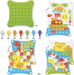 W opakowaniu znajduje się plastikowa podstawa, trzy dwustronnie ilustrowane karty oraz łącznie 40 kolorowych kołeczków. Dzieci mogą układać według wzorów lub tworzyć własne obrazki – zabawa, która rośnie razem z nimi.