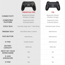 GameSir Tarantula Pro to premium bezprzewodowy kontroler zaprojektowany do rywalizacji i komfortowych maratonów. Potrójna łączność (Bluetooth / 2,4 GHz / USB-C), niska latencja oraz kompatybilność ze Switch, PC, iOS, Android i Steam czynią go uniwersalnym wyborem na wszystkie platformy. Nowe drążki Mag-Res TMR łączą zalety potencjometru i efektu Halla dla płynnego, precyzyjnego i energooszczędnego działania.