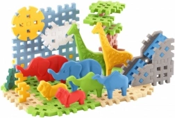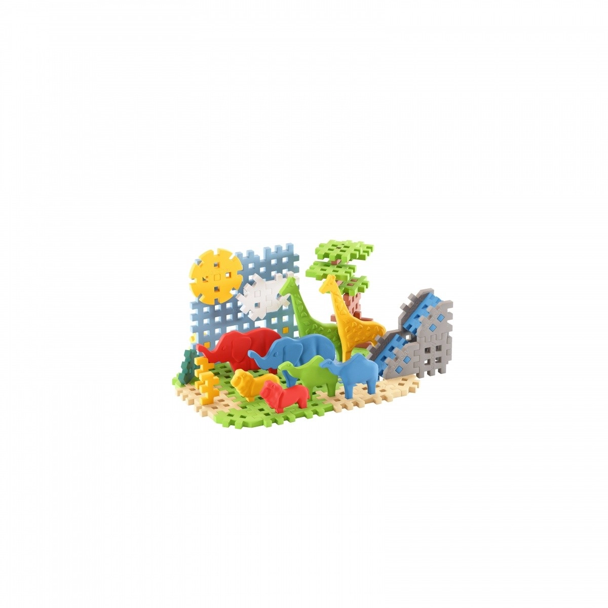 Z klockami Mini Waffle - Zwierzęta Sawanny dzieci mogą tworzyć własny fantastyczny świat pełen afrykańskiego życia. Zestaw zawiera 50 elementów o różnych kształtach, które pozwalają zbudować elementy sceniczne, takie jak malowniczy wodospad, oraz imponujące tło sawanny. W komplecie znajduje się także lwia rodzina wygrzewająca się na słońcu, słonie przy wodopoju oraz żyrafy majaczące na horyzoncie.