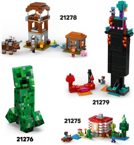 W zestawie są ikoniczne postacie i moby z MINECRAFT: Alex, górnik, pająk z miejscem dla jeźdźca, szkielet–strzelec oraz uroczy niedźwiadek polarny. Po skończonej zabawie model w kształcie kilofa zamienia się w efektowny element wystroju pokoju dziecięcego.