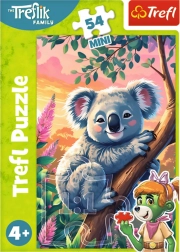 Puzzle Treflíci z motywem koali składają się z 54 elementów, każdy o wielkości 2,2 cm. Ten minimalny rozmiar umożliwia łatwe chwytanie, dlatego są odpowiednie dla małych dzieci rozpoczynających przygodę z puzzlami. Ułożony obrazek ma wymiary około 13 × 20 cm, co czyni go kompaktowym i odpowiednim do zabawy na stole lub w innej mniejszej przestrzeni.