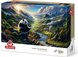 Odkryj radość z układania dzięki naszej wyjątkowej układance Schronienie dla Pandy z 500 elementami, która przeniesie Cię do świata spokoju i nadziei, o wymiarach 48 x 34 cm.