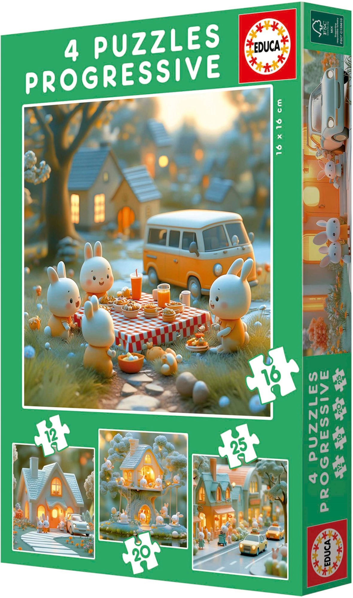 Odkryj radość z układania dzięki zestawowi EDUCA Królicze miasto 4w1. Zestaw zawiera cztery różne układanki o stopniowo rosnącym poziomie trudności: