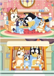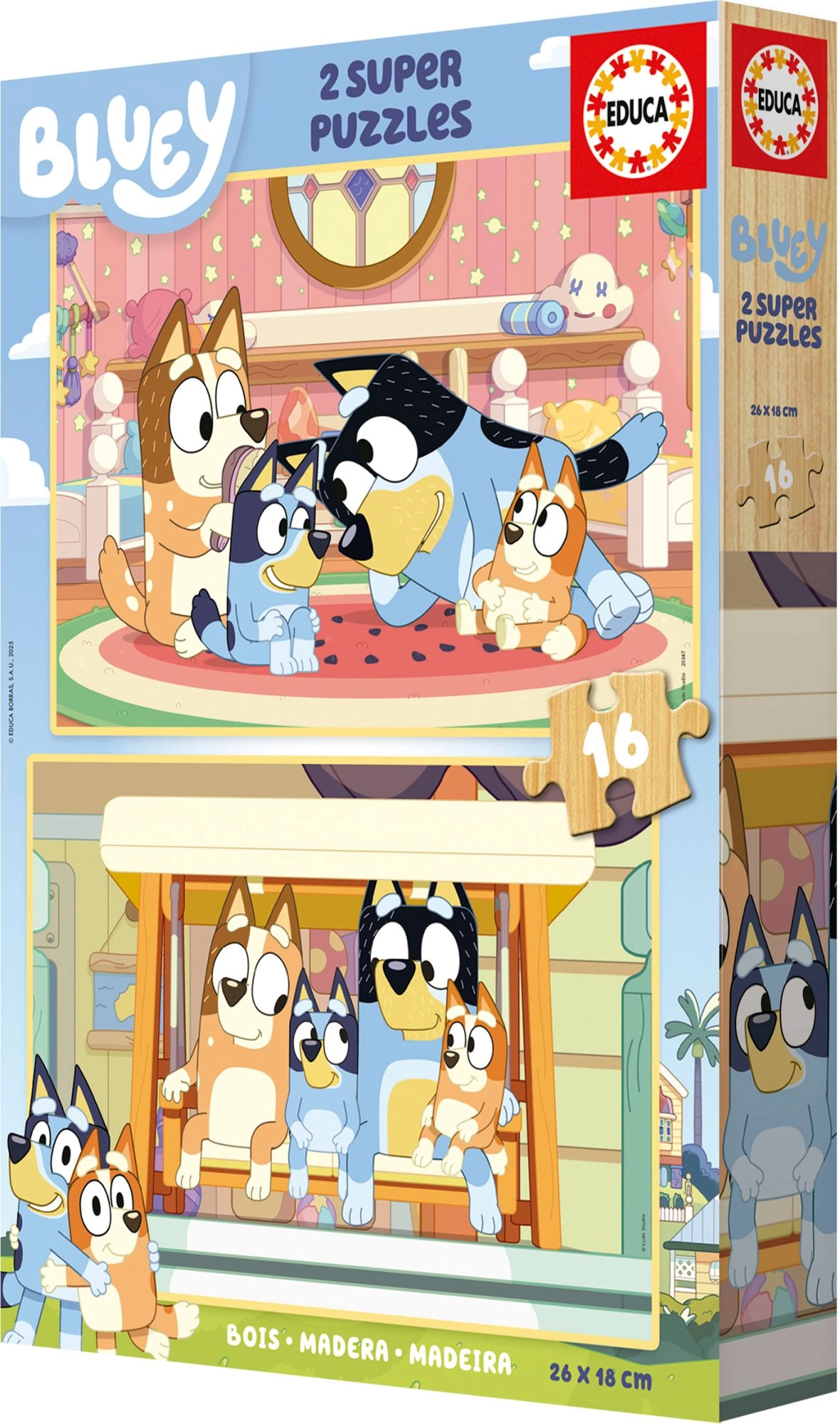 Odkryj wspaniały świat Bluey z tymi wysokiej jakości drewnianymi puzzlami od EDUCA. Każde pudełko zawiera dwa puzzle, które są: