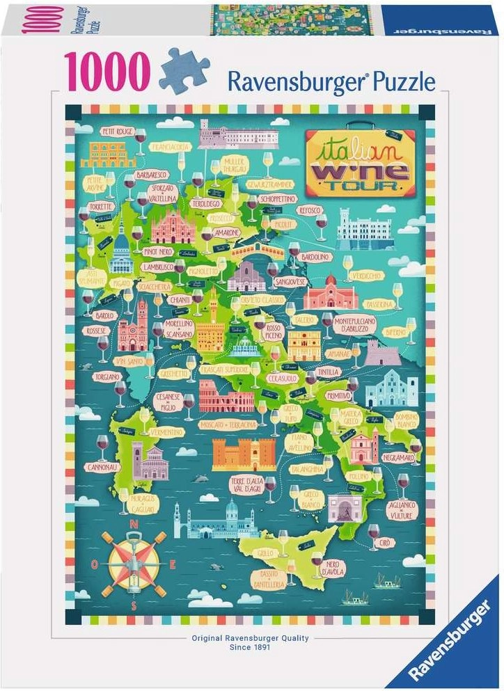Odkryj urok Włoch dzięki unikalnym puzzlom z mapą składającą się z 1000 elementów. Idealne dla miłośników wina i detali, te puzzle poprowadzą Cię przez fascynujący winiarski krajobraz Włoch i z pewnością zachwycą każdego fana układanek.